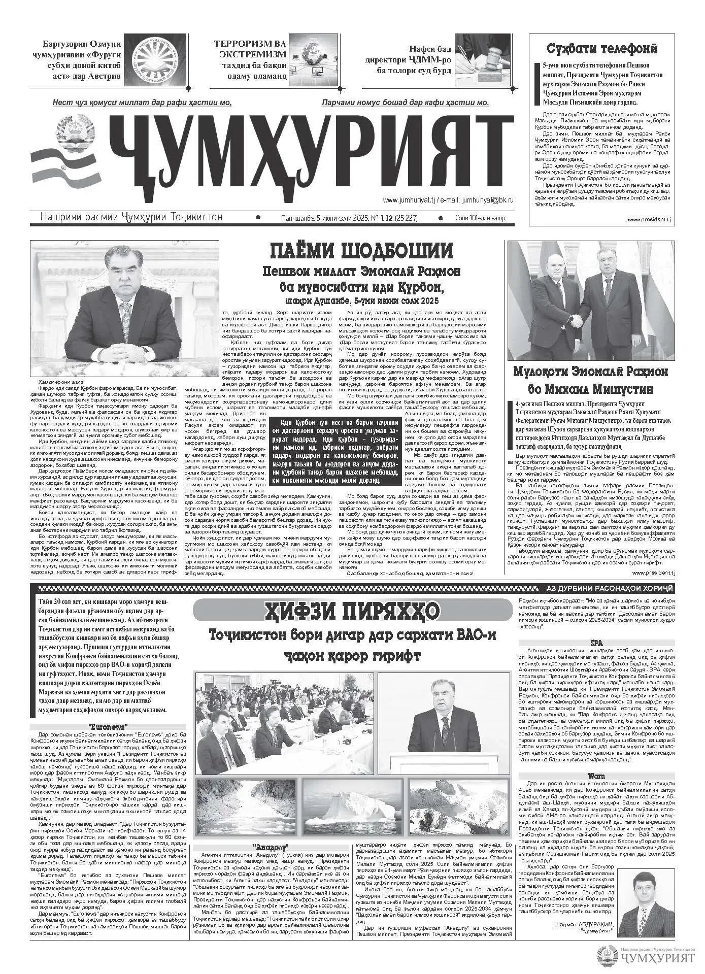 Ҷумҳурият № 112 05 июн 2025, Панҷшанбе 46 Ҷумҳурият № 112.pdf [3.11 Mb] (зеркашиҳо: 25) Санаи нашр: 05.06.2025