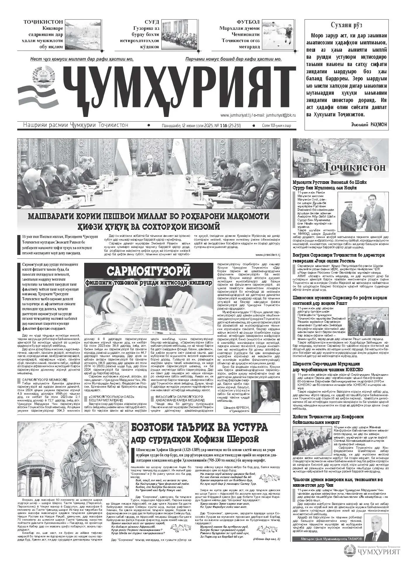 Ҷумҳурият № 116.pdf 13 июн 2025, Ҷумъа 38 Ҷумҳурият № 116.pdf [6.36 Mb] (зеркашиҳо: 35) Санаи нашр: 2025-06-12 №: 116