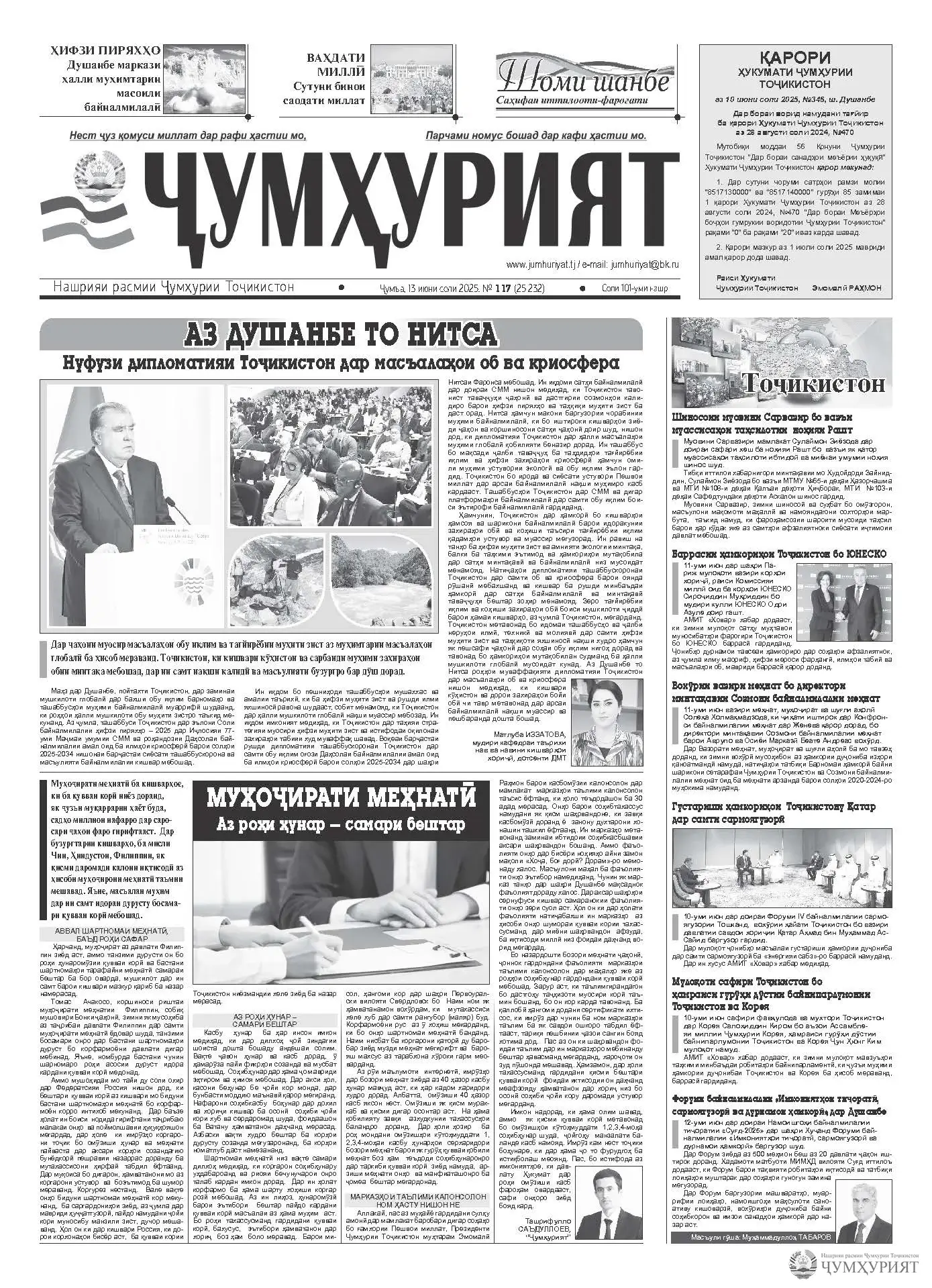 Ҷумҳурият № 117 16 июн 2025, Душанбе 75 Ҷумҳурият № 117.pdf [3.96 Mb] (зеркашиҳо: 33) Санаи нашр: 13.06.2025 №: 117