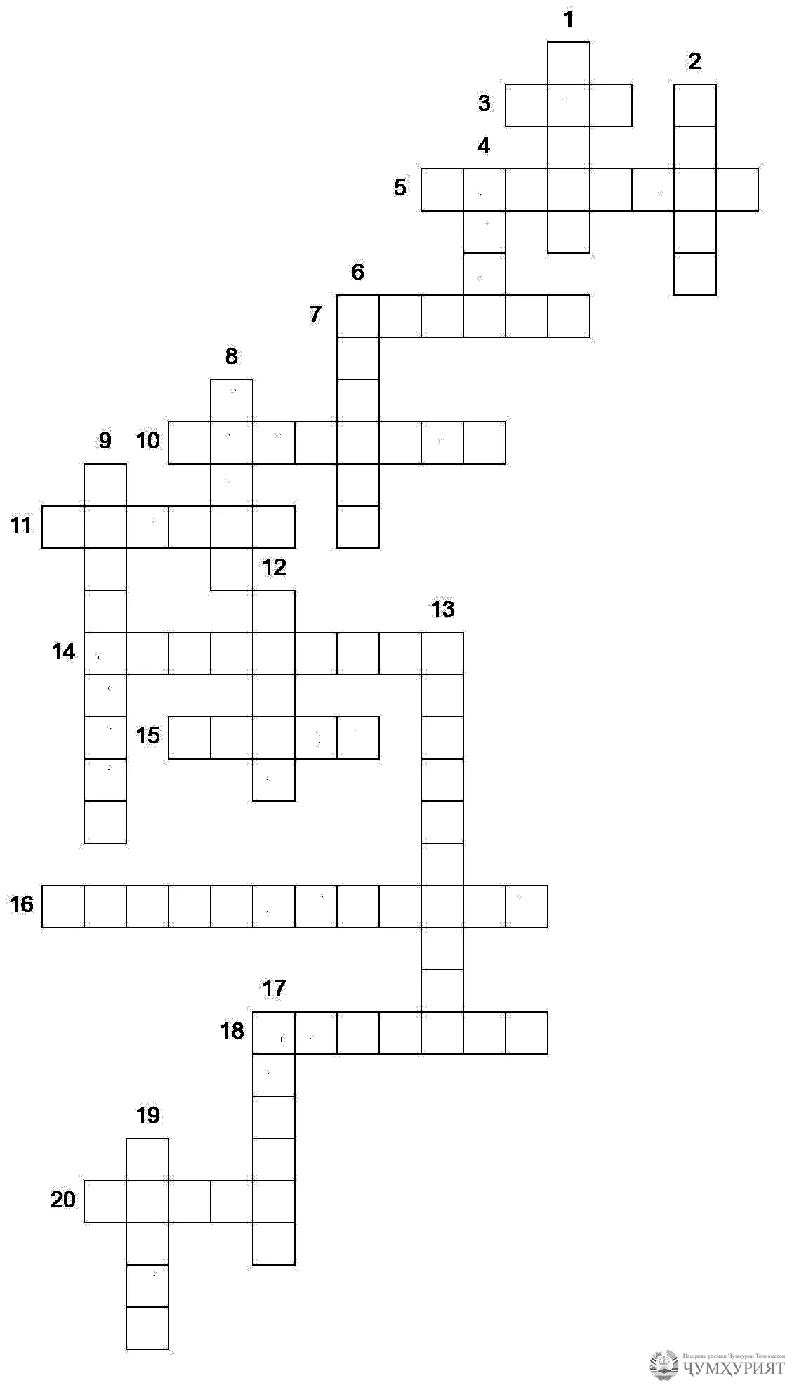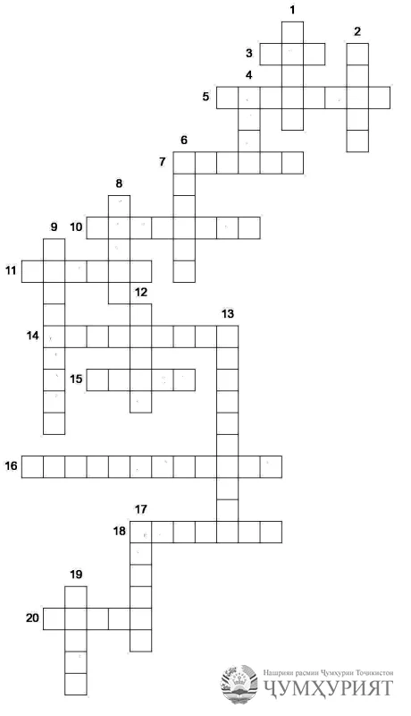 15. Тоҷикистон давлати ҳуқуқбунёд ва .... 16. Санади олии ҳуқуқии давлат. 17. Ҳудуди як қаламрав ё сарзамин. 18. Пойтахт, рӯзи ҳафта. 19. Дастурҳо, муқаррарот ва аҳкоме, ки аз тарафи парлумон барои барқарории назм ва идора кардани умури ҷомеа қабул мешавад. 20. Як ҷузъи қонунҳо.
