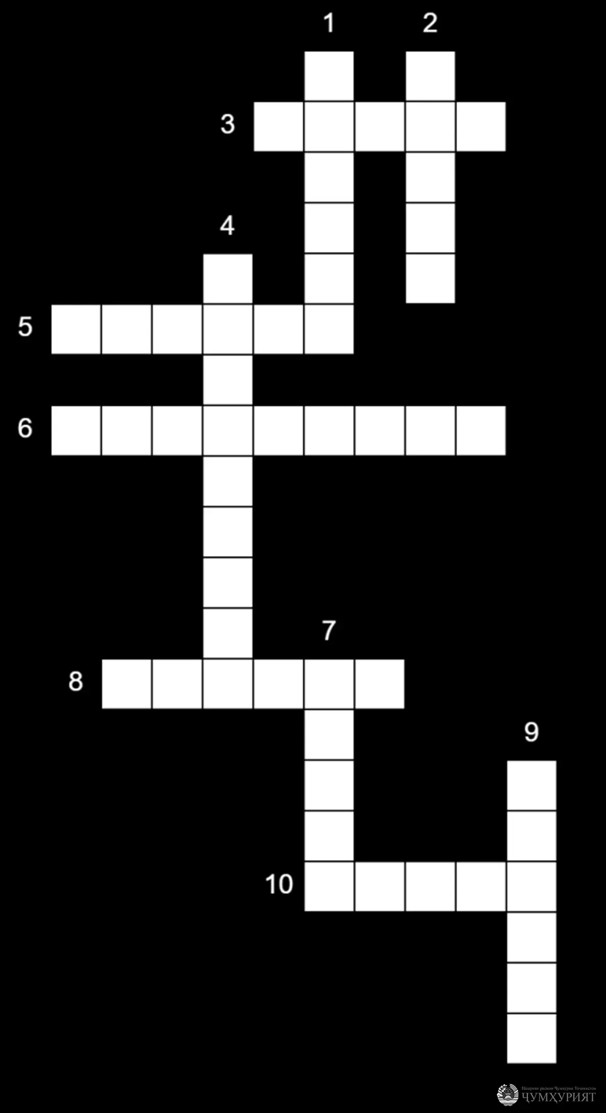 1. Воҳиди пули миллии Тоҷикистон. 2. Аломат, асар, ёдгор. 3. Тирамоҳ. 4. Онро парчамбардори миллат меноманд. 5. Сардафтари адабиёти форсу тоҷик. 6. Сардори давлат. 7. Ҳаммаънои Ватан. 8. Азиз, арҷманд, муҳтарам. 9. Ливо, байрақ. 10. Моҳи 11-уми солшумории мелодӣ.