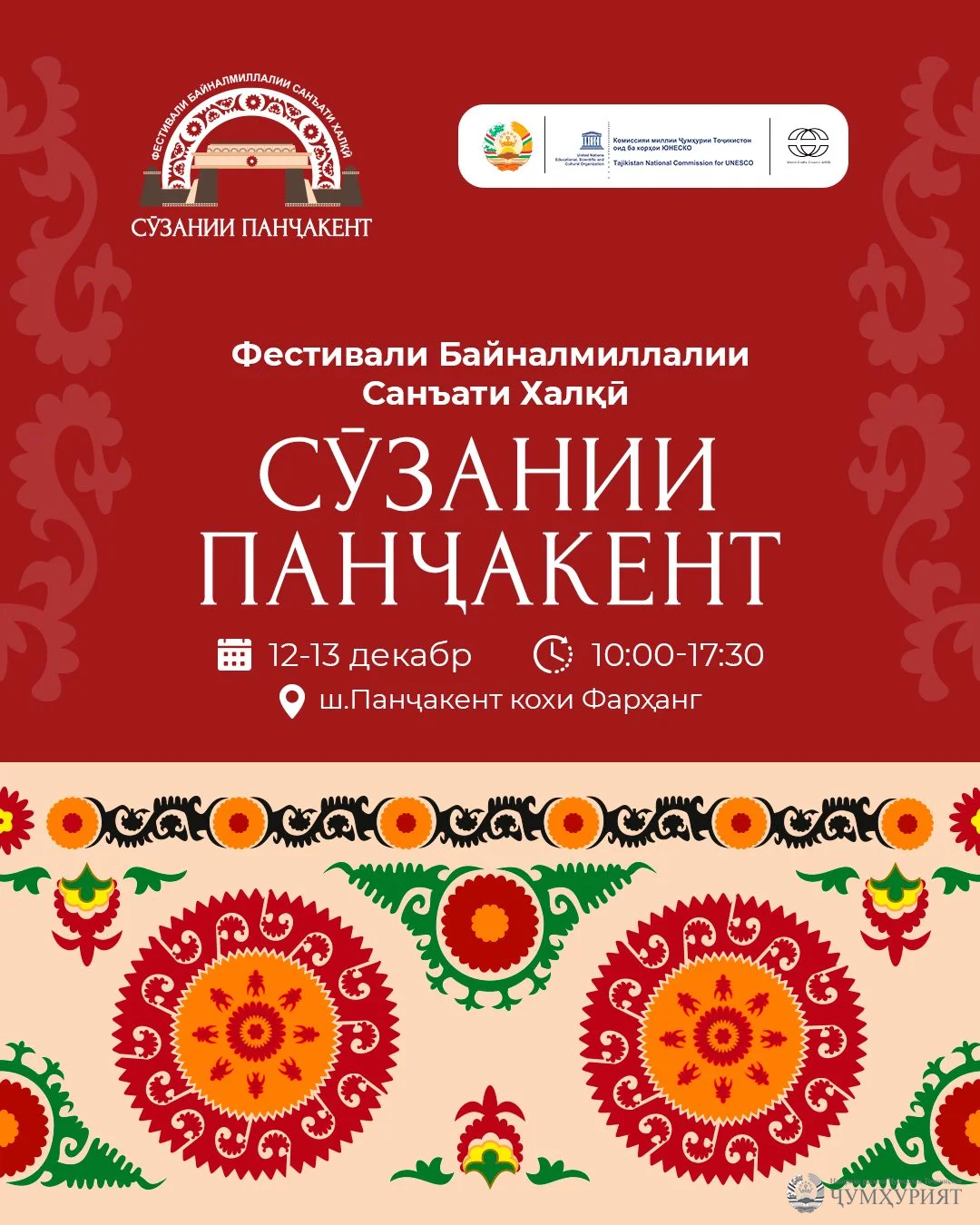 қайд карданд. Дар доираи Фестивали байналмилалии “Сӯзании Панҷакент”, дар Кохи Лоиқи шаҳри Панҷакент дар мавзуи “Санъати сӯзандӯзӣ: масоили ҳифзи анъанаҳо” конфронси илмӣ-амалии байналмилалӣ баргузор гардид. Конфронс бо сухани муқаддимавии муовини раиси вилояти Суғд Ҷамшед Ҷӯразода ифтитоҳ гашт. Таъкид гардид, ки ҳунари сӯзандӯзӣ дар ин шаҳри бостонӣ аз аҳди қадим, аз нақшҳо дар рӯйи сафолу фулузот ва деворнигораҳо ибтидо гирифтааст. Давоми асрҳо анъанаи нақшпартоӣ ва дӯхтани сӯзанӣ идома ёфта, бо эътирофи Панҷакент ҳамчун шаҳри ҷаҳонии