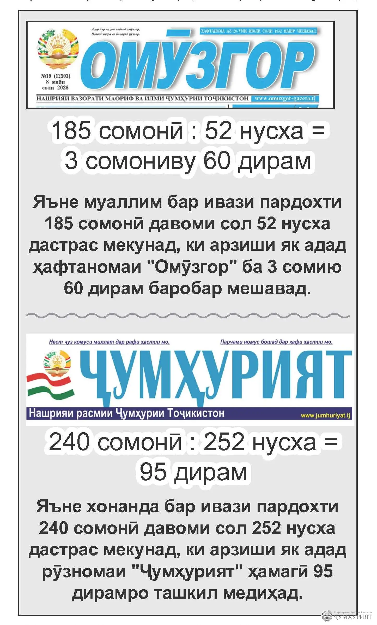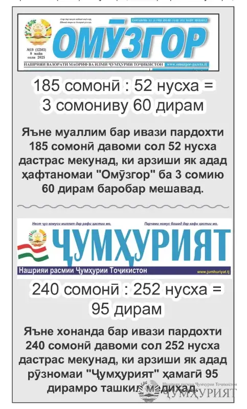 Акнун худ қазоват кунед, муаллим аз обуна ба кадоме аз ин нашрияҳо бештар бурд мекунад: «Омӯзгор» ё «Ҷумҳурият».
