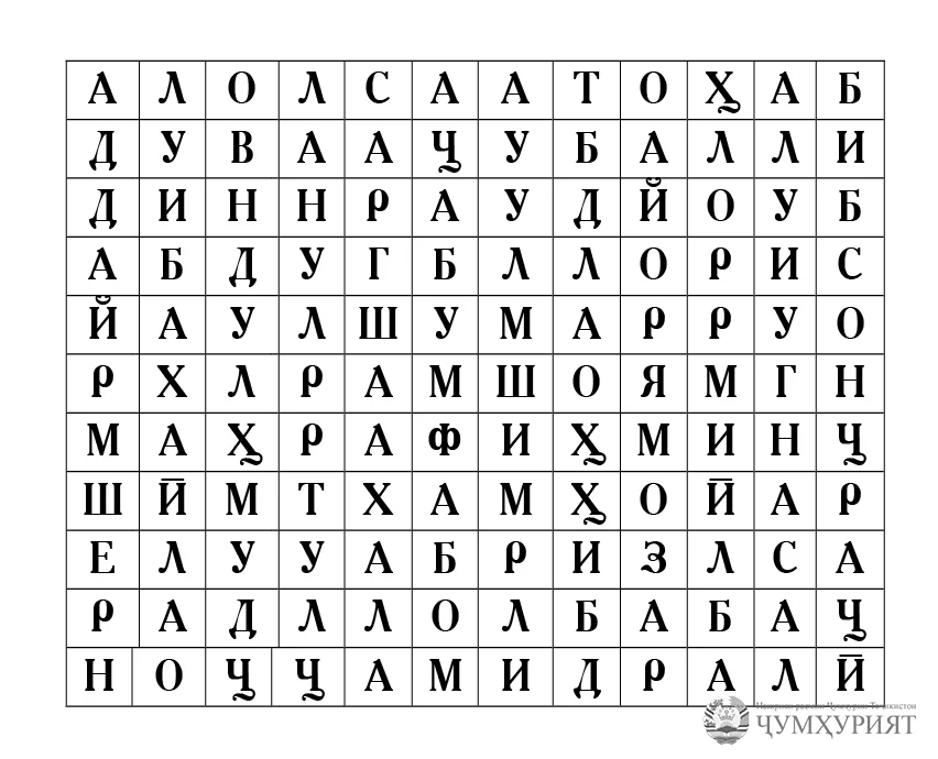 Дар ин филворд номи ҳунармандони театр ва кинои тоҷик нуҳуфтаанд. Тибқи қоидаи ҳалли филворд, шумо бояд аз чап ба рост, аз рост ба чап, аз боло ба поён ва аз поён ба боло ҳаракат карда, онҳоро пайдо намоед.