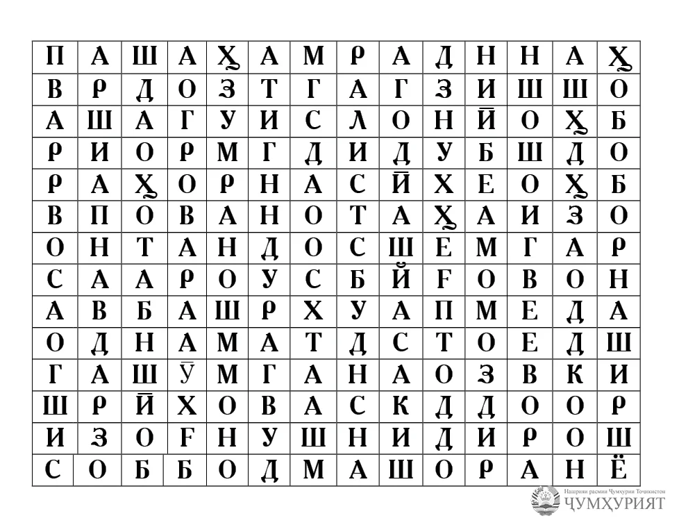 8. Носир 9. Раҷабгул 10. Мушаррафа 11. Дилбар 12. Аслӣ 13. Гурминҷ