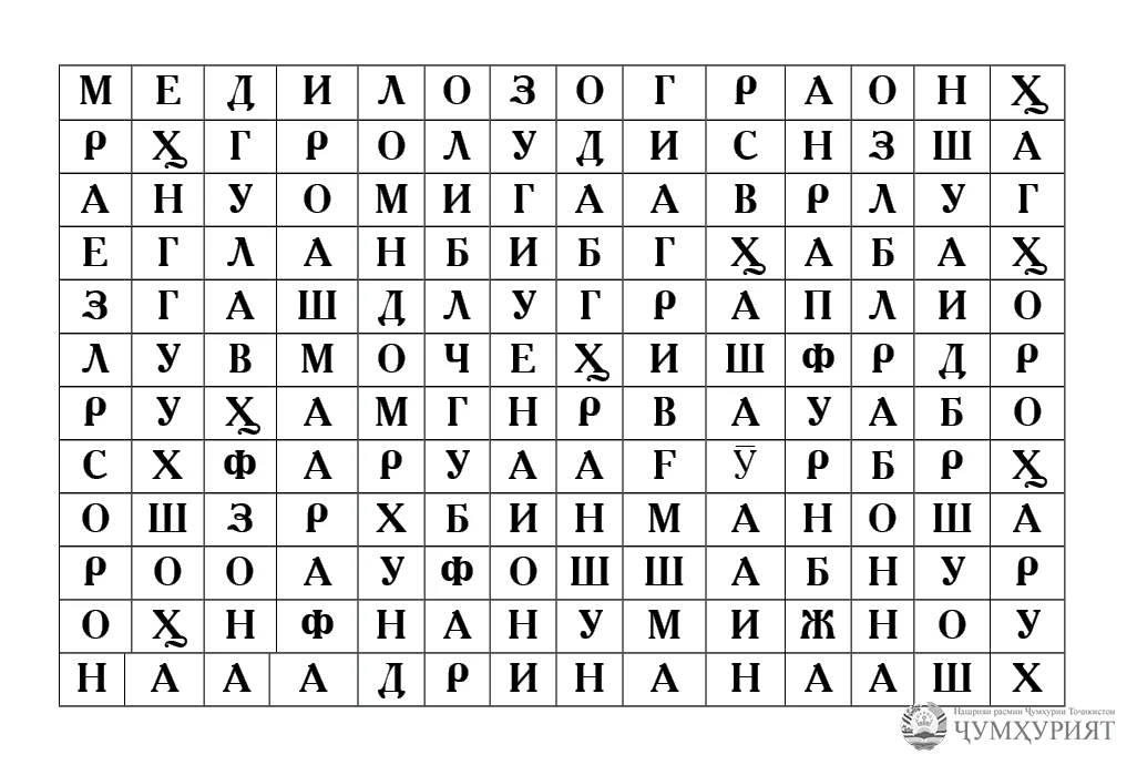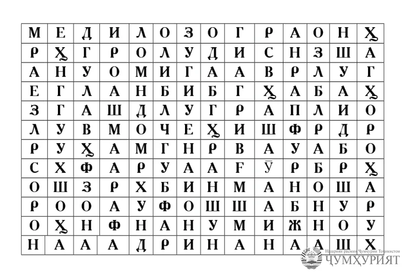 Дар ин филворд номҳои зебои тоҷиконаи бонувон ҷой дода шудаанд. Тибқи қоидаи ҳалли филворд, шумо бояд аз чап ба рост, аз рост ба чап, аз боло ба поён ва аз поён ба боло ҳаракат карда, онҳоро пайдо намоед.